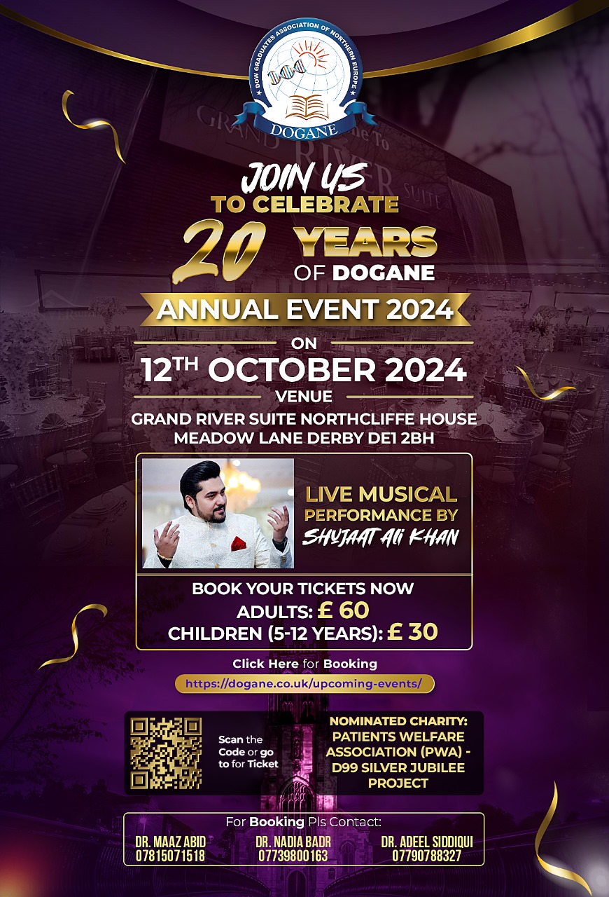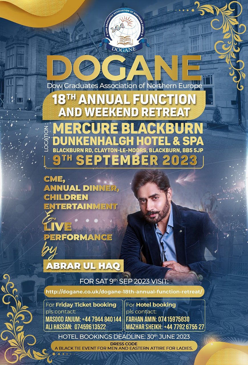 The Dow Graduates Association of Northern Europe (DOGANE) is a UK based charity which was set up in 2004. Graduates from Dow University of Health Sciences, Karachi, commonly referred to as ‘Dowites’, have been working across the United Kingdom in different capacities as Consultants, General Practitioners and hospital practitioners for many decades. This is an alumni organisation for one of the oldest and prestigious medical institution in Pakistan. The main aims and objectives of DOGANE are;